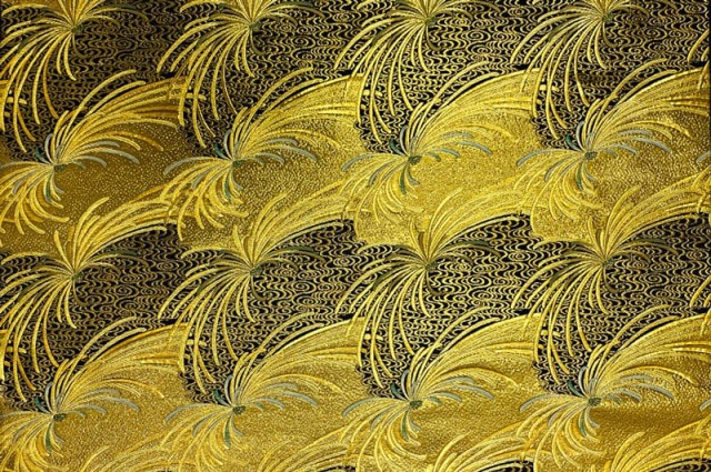 金らんと呼ばれるこの和模様の布地は、色や柄によりかっこいい、かわいい、エキゾチック、オリエンタル、豪華、高級、と印象が変わります。職人の技が詰まった一品で、和風の衣装やインテリアの装飾など多岐にわたる用途に応用できます。