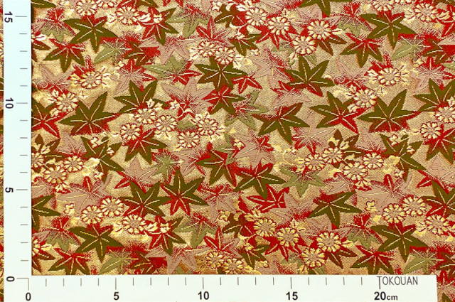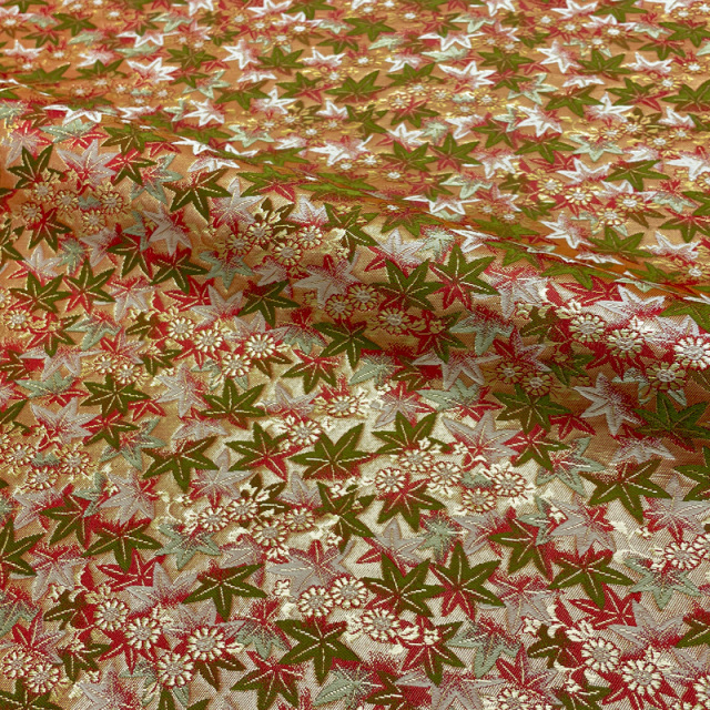 こちらの和柄生地は、緑色、金色、赤色などで紅葉文様を散りばめた優雅な金襴生地です。大人っぽくも可愛らしく、どんなシーンでも使いやすい生地です。