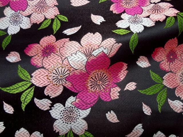 こちらの和柄生地は、黒色、淡い桃色、やや橙色調の桃色である唐紅色の3色展開の織地で、桃色、金色、白色などの桜の花びらが舞うように配された、華やかな金襴生地です。大人っぽくも可愛らしく、どんなシーンでも使いやすい生地です。