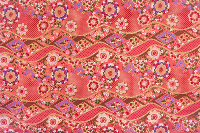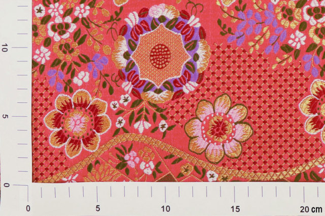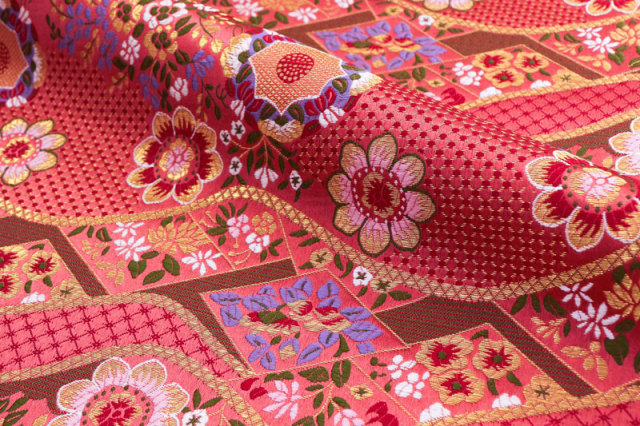 金らんと呼ばれるこの和模様の布地は、色や柄によりかっこいい、かわいい、エキゾチック、オリエンタル、豪華、高級、と印象が変わります。職人の技が詰まった一品で、和風の衣装やインテリアの装飾など多岐にわたる用途に応用できます。