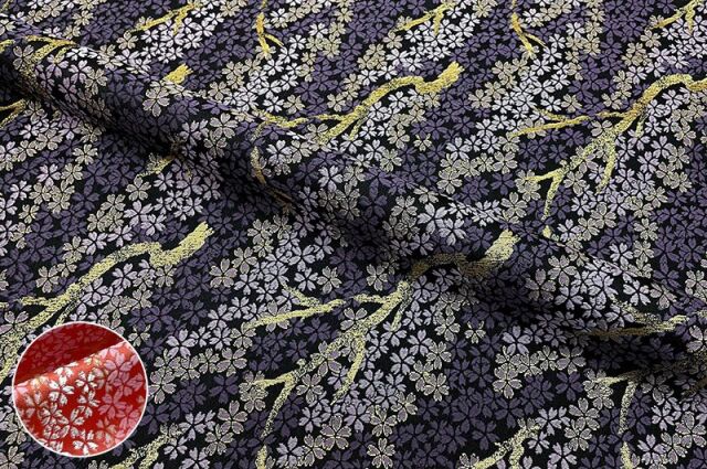 こちらの和柄生地は、織地は紫色、赤系色の唐紅色の2色展開で、枝付きの満開の桜が華やかに配された金襴生地です。大人っぽくも可愛らしく、どんなシーンでも使いやすい生地です。