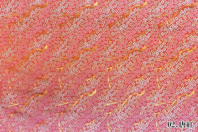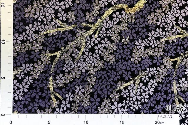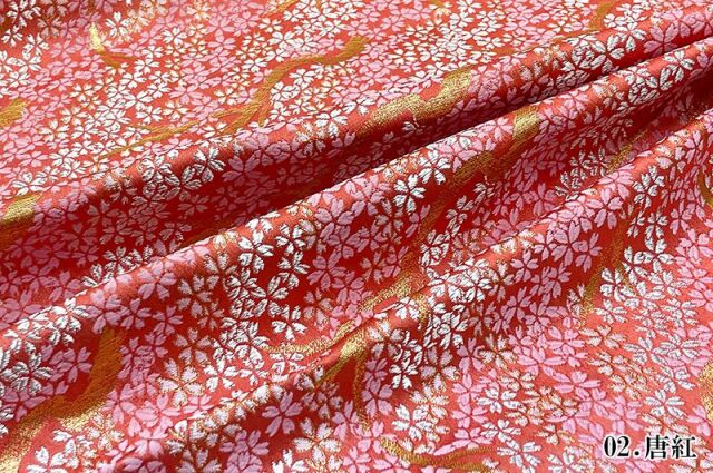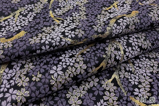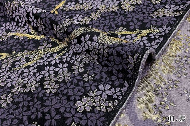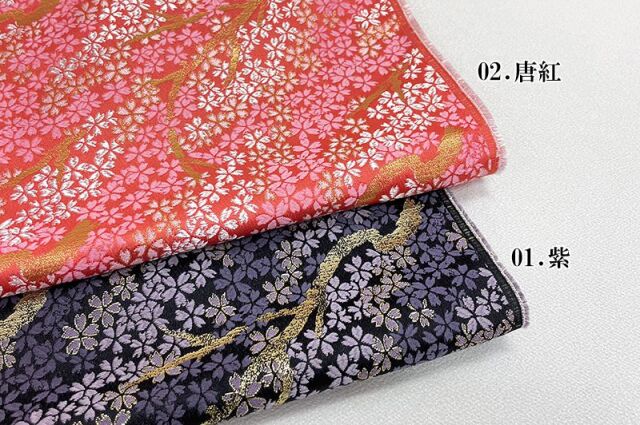 織地は、パープル、レッドカラー系色の唐紅色の2色展開です。枝付きの満開の桜が華やかに配された金襴生地で、大人の趣味から、お子様や園児、学生まで、幅広い層にご利用頂けます。宮司や僧侶など、伝統的な職業の方々にも重宝されているほか、インテリアやお土産品を製造する土産品製造者や工務店の方々にも人気の素材です。犬の服や小物にも使用されることから、ペット用のアパレルにも応用可能です。
