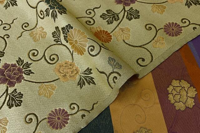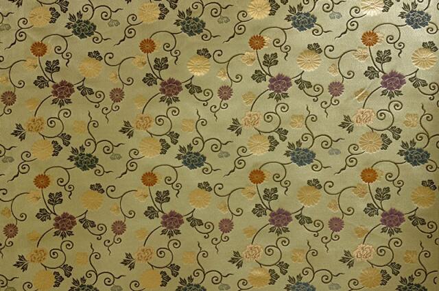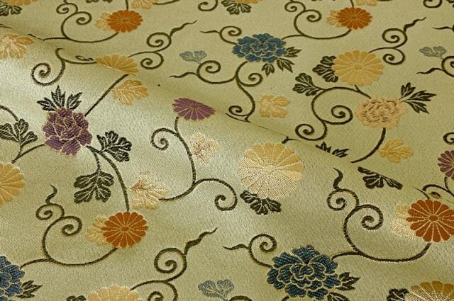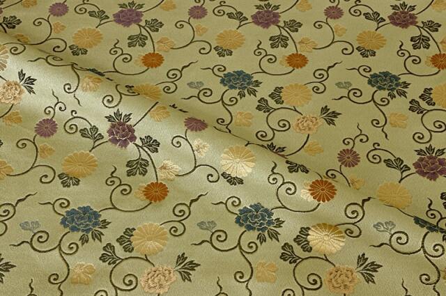 「百花の王」と呼ばれる豪華さを持つ牡丹と、高貴な吉祥文様とされている菊を表現した金襴生地です。