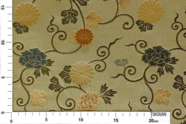 こちらの和柄生地は、黄緑色の織地に、金色、緑色、橙色などの草花を散りばめた優雅な金襴生地です。大人っぽくも可愛らしく、どんなシーンでも使いやすい生地です。