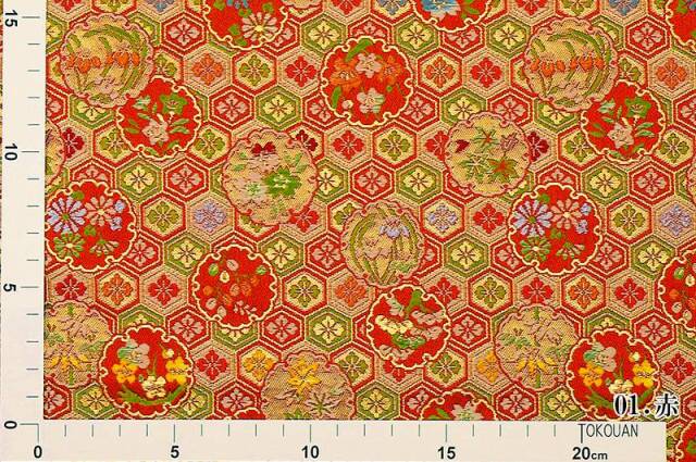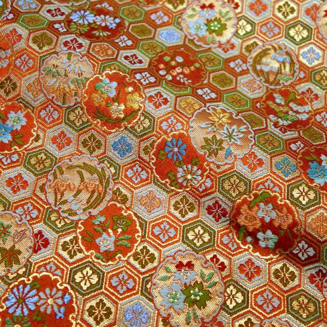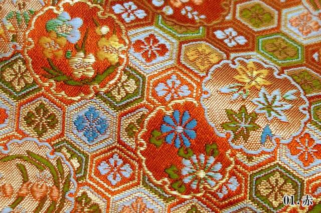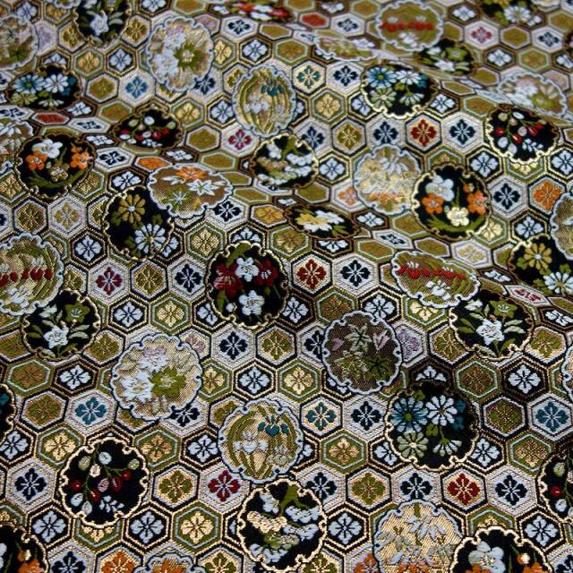 こちらの和柄生地は、赤色と黒色の2色展開の織地で、亀甲に、白、緑、水色などの花菱文様などが織り込まれた、優雅な金襴生地です。どんなシーンでも使いやすい生地です。