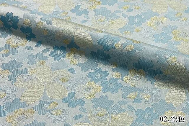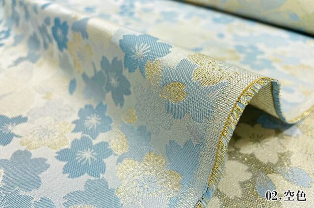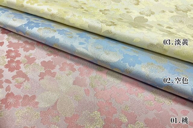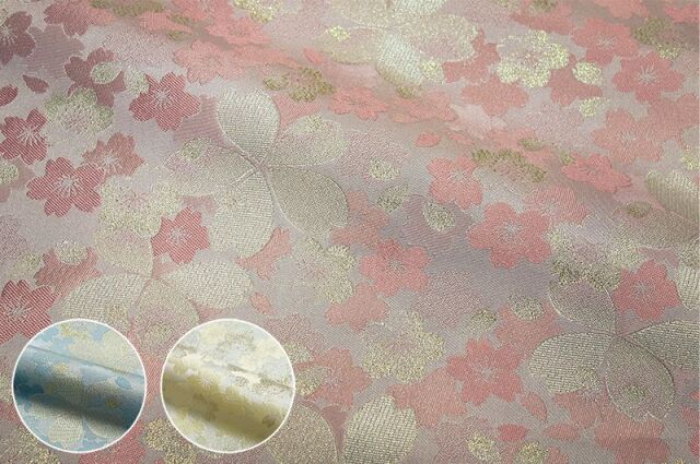 こちらの和柄生地は、明るく淡い青色の空色、淡い黄色の淡黄色、桃色の3色展開の織地で、桜の文様が配された、華やかな金襴生地です。大人っぽくも可愛らしく、どんなシーンでも使いやすい生地です。