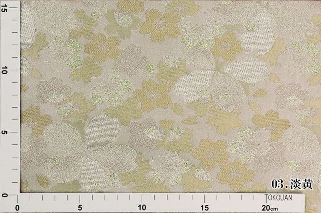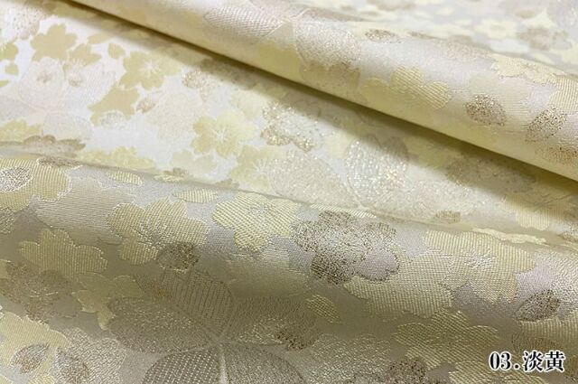 明るく淡いブルーカラーの空色、淡いイエローの淡黄色、ピンク色の3色展開の織地に、桜の文様が配された華やかな金襴生地で、大人の趣味から、お子様や園児、学生まで、幅広い層にご利用頂けます。宮司や僧侶など、伝統的な職業の方々にも重宝されているほか、インテリアやお土産品を製造する土産品製造者や工務店の方々にも人気の素材です。犬の服や小物にも使用されることから、ペット用のアパレルにも応用可能です。