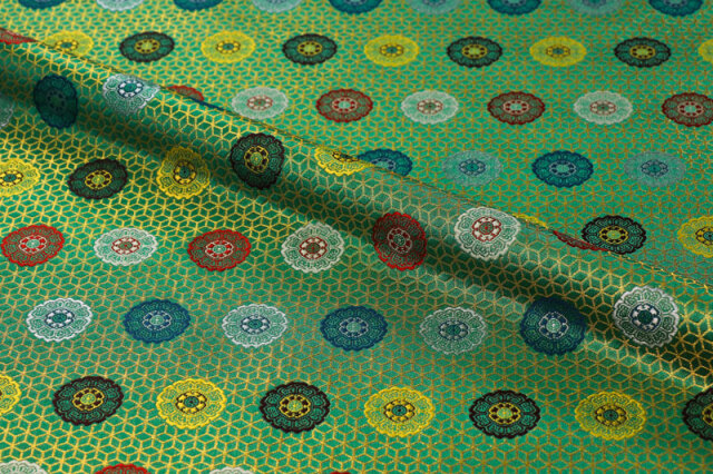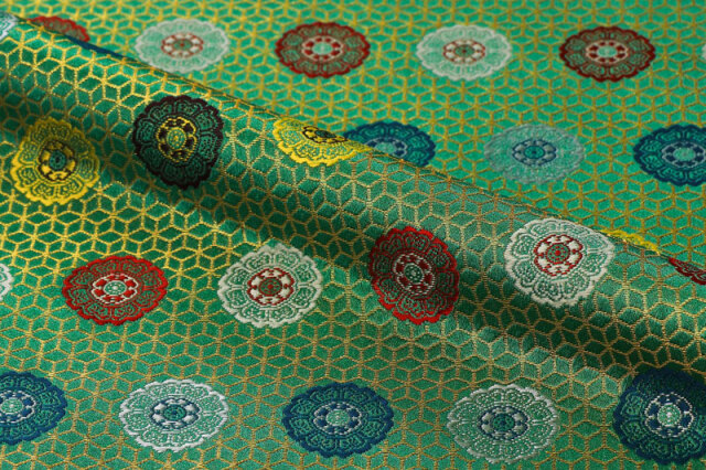 鮮やかな緑地に、金糸で菱文を織り込んだ金襴生地です。