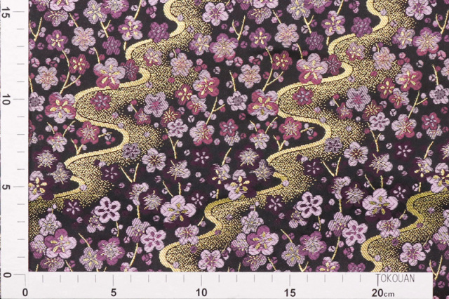 こちらの和柄生地は、黒色の織地で、濃淡さまざまな紫色の梅の花が、特徴的な金襴生地です。大人っぽくも可愛らしく、どんなシーンでも使いやすい生地です。