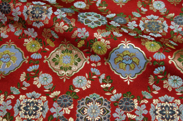 レッドカラーの織地に、グリーン、ホワイト、イエローなどの花々が配された金襴生地で、大人の趣味から、お子様や園児、学生まで、幅広い層にご利用頂けます。宮司や僧侶など、伝統的な職業の方々にも重宝されているほか、インテリアやお土産品を製造する土産品製造者や工務店の方々にも人気の素材です。犬の服や小物にも使用されることから、ペット用のアパレルにも応用可能です。