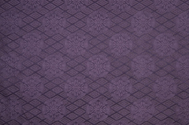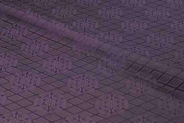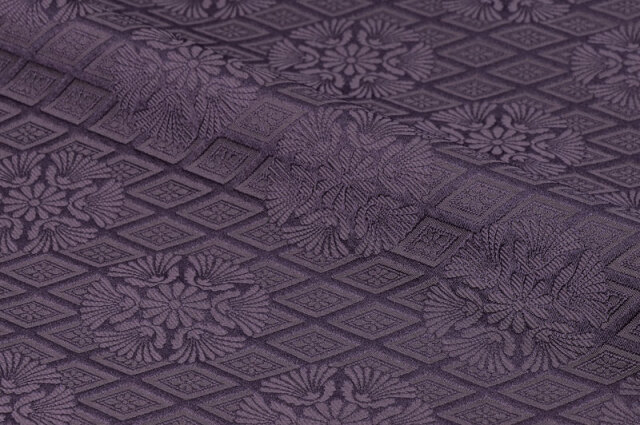 こちらの和柄生地は金糸を使っていない、一色の柄無し(無地)生地ですが、菊の花が織り出された花柄の金襴織物です。落ち着いた藤紫色で光の加減で輝く織模様が美しく浮き上がる生地です。