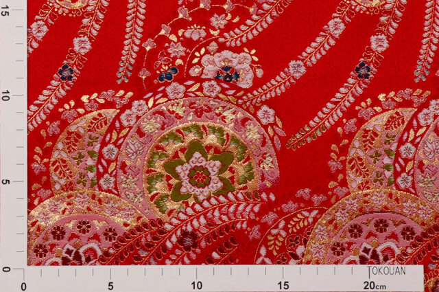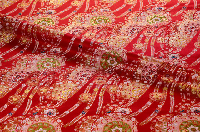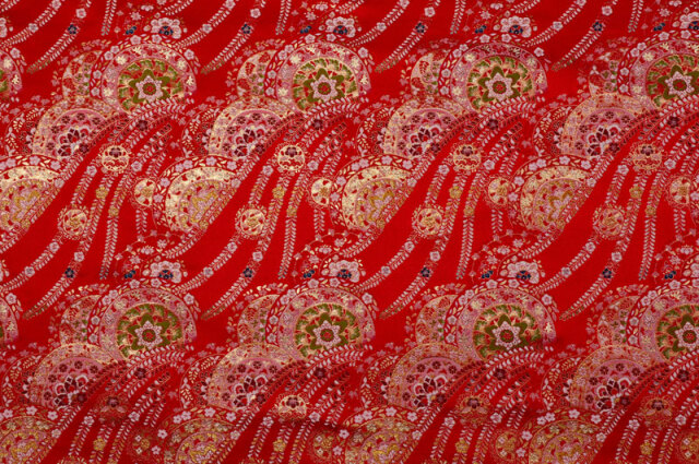 金らんと呼ばれるこの和模様の布地は、色や柄によりかっこいい、かわいい、エキゾチック、オリエンタル、豪華、高級、と印象が変わります。職人の技が詰まった一品で、和風の衣装やインテリアの装飾など多岐にわたる用途に応用できます。
