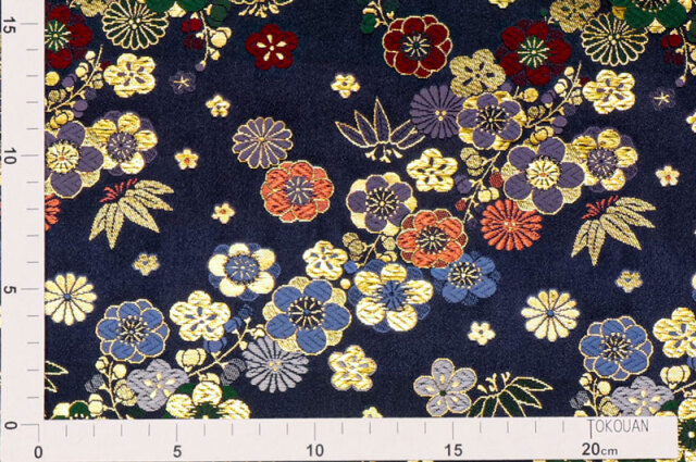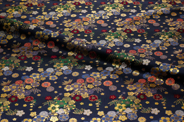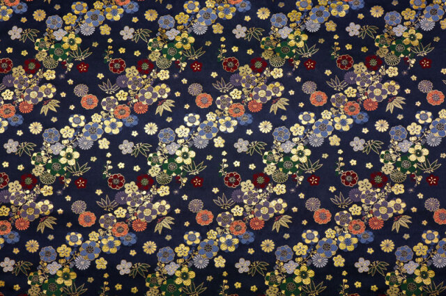 こちらの和柄生地は、紺色の織地に、青、赤、緑、紫、金色などの花々が配された、華やかな金襴生地です。大人っぽくも可愛らしく、どんなシーンでも使いやすい生地です。