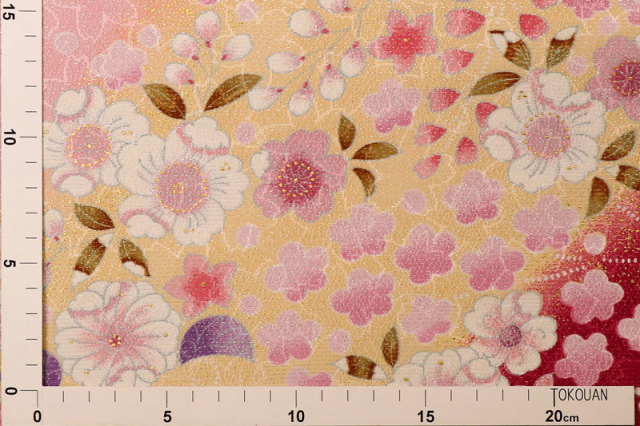 キラキラとした桜の地紋を織り込んだ生地に、春を連想させる優しい雪持花を文様にした和柄生地です。