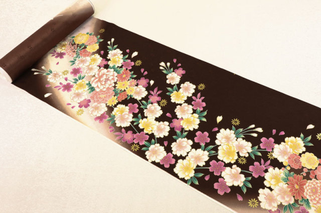 京・金彩友禅 八重桜に牡丹菊花(檜皮色)