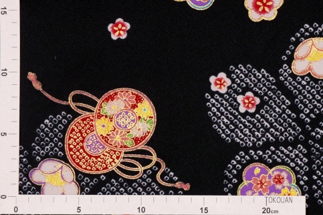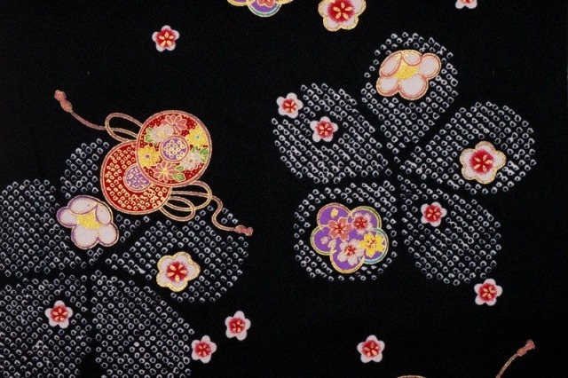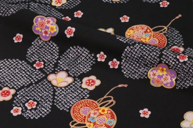 黒の地のちりめん生地に、鹿の子柄と鼓、可愛らしい花々を描いた友禅です。