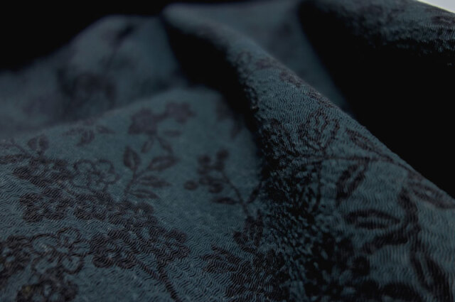 様々な鳥と果実や草花を配した文様を、藍染で染めた正絹ちりめん生地です。