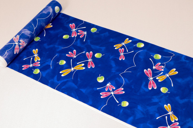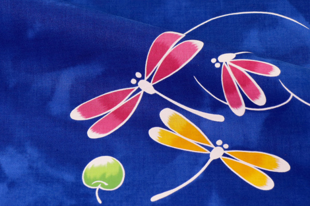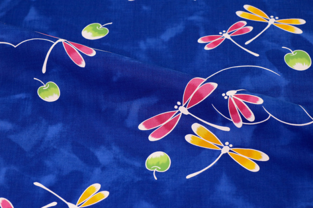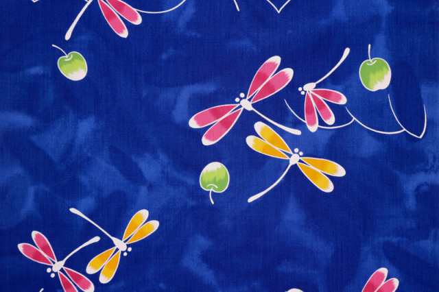 青の地に、トンボとリンゴが可愛らしい浴衣生地です。